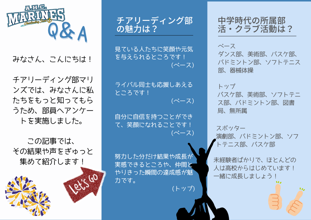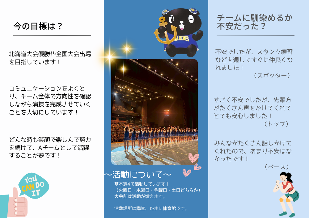 3月に入ってから、選手は新入生歓迎会、4月のイベント出演演技練習、新学期ワンデー(5月10日実施の安全講習会)、北海道大会に向けて練習を積んでいます。チアリーディングは高校生から始める選手が多い競技です。現在の選手にチアリーディングへの思いを聞いてみました。