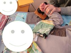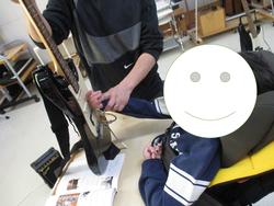 学部合同で行ったコラグラフ(凸版画)作りの様子です。国語で詩の学習を行うのですが、扱う水辺の情景をイメージして美術でジオラマを作りました。今回は詩のイメージをもとに凸版画で池や水草を作りました。最初に、生徒は指導者と一緒に色や凸版の材料を選びました。次にカーペットクリーナー様の土台に輪ゴムやモールなどをコロコロ付けて、凸版を作りました。そして、色を付けてまたコロコロ。息を合わせ楽しそうに活動していました。できあがった版画を見て、みんな満足気でした。