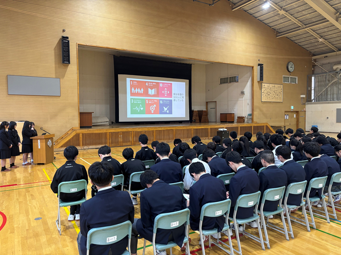 11月13日の午後に、2年6組のグローバルコース生7名が平岡中学校の「総合的な学習の時間」の講師として出前授業を行いました。生徒7名は「SDGsの達成に向けて」「フェアトレードとは何か」について中学3年生の全員に向けて講話を行いました。中学生からは「SDGsやフェアトレードについて詳しく知ることができました」「高校で行われている探究活動について知ることができて良かったです」等 と前向きな感想をたくさんもらいました!
