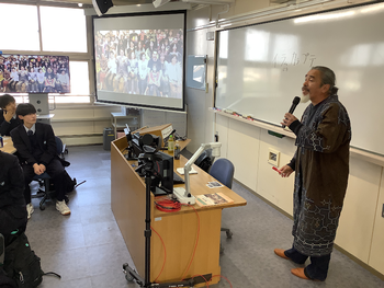 3年次のグローバルコース生全員が受講する「ワールドスタディズ」の授業に、版画家であり札幌アイヌ協会共同代表の結城幸司さんが来校しました。ワールドスタディズの授業では、計3時間を使って「アイヌを事例に世界の先住権問題を考える」をテーマに学習をしています。12月1日はこの授業の2時間目の授業で、結城さんよりアイヌの歴史・文化・世界の先住民族の動向について講演をしていただきました。結城さんも指摘されていた日本の課題でもある「先住民権の回復」について、次週のワールドスタディズの授業では探究します。