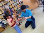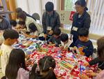 五輪団地の住民の方たちとまこまないみどりまち保育園の園児たちに昔の遊び方について伝承をすることを目的に交流しました。サポートコースの生徒たちは事前にURコミュニティの方と打ち合わせをし、元々内容に含まれていた、めんこ、あやとり、手遊び、紙の着せ替えに加え、新たに糸でんわを生徒たちから提案し、糸でんわのブースを設置しました。昭和、平成、令和の三世代が交わり、教わる立場と教える立場がそれぞれの年代からありました。伝え合い、分かり合い、繋がり合う、そんな素敵な時間となりました。