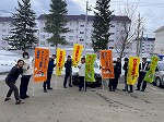 警察から依頼を受けて、自分たちで作成したのぼりを掲げて交通安全啓発活動を行いました。真駒内駅前を通る人や運転されている方が交通安全に気を付けていただくように声をかけながら遠くの方にも目を引くデザインで仕上げたのぼりを持ち啓発をしています。