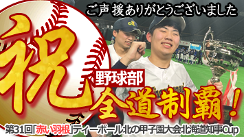 ≪応援のお礼≫ 野球部主将 福留 悠翔 このたびは、第31回「赤い羽根」ティーボール北の甲子園大会北海道知事Cupにおいて、私たちみなみの杜野球部を応援していただき、誠にありがとうございました。皆さまの温かいご声援のおかげで、見事優勝を果たし、悲願の初優勝を達成することができました。 おととしは、あと一歩のところまで迫りながらも、最後はじゃんけんで涙をのみました。あの悔しさを胸に、私たちは「忘れ物を取りに行く」を合言葉に、日々の練習に励んできました。 決勝戦は、最終回に猛打で一挙に逆転するという劇的な展開となりました。裏の守りでは、選手たちが集中力を切らすことなくファインプレーを連発し、最後まで全員で守り抜きました。苦しい場面でも声を掛け合い、支え合いながら戦い抜いたことが、この結果につながったのだと思います。 決勝の相手は目標としてきた、大会5連覇中の札幌NFCではなく、そのNFCを破って勢いに乗った強豪、北斗高等支援学校でした。しかし、どの相手であっても、自分たちの野球を貫こうと挑み、全力を出し切ることができました。 これまで支えてくださった保護者の皆さま、地域の皆さま、そして日頃からご指導くださっている先生方に心より感謝申し上げます。この優勝は、私たちだけの力ではなく、支えてくださったすべての方々とともに勝ち取ったものです。 今後も感謝の気持ちを忘れず、さらに成長できるよう努力を続けてまいります。引き続きみなみの杜野球部へのご声援をよろしくお願いいたします。本当にありがとうございました。 |