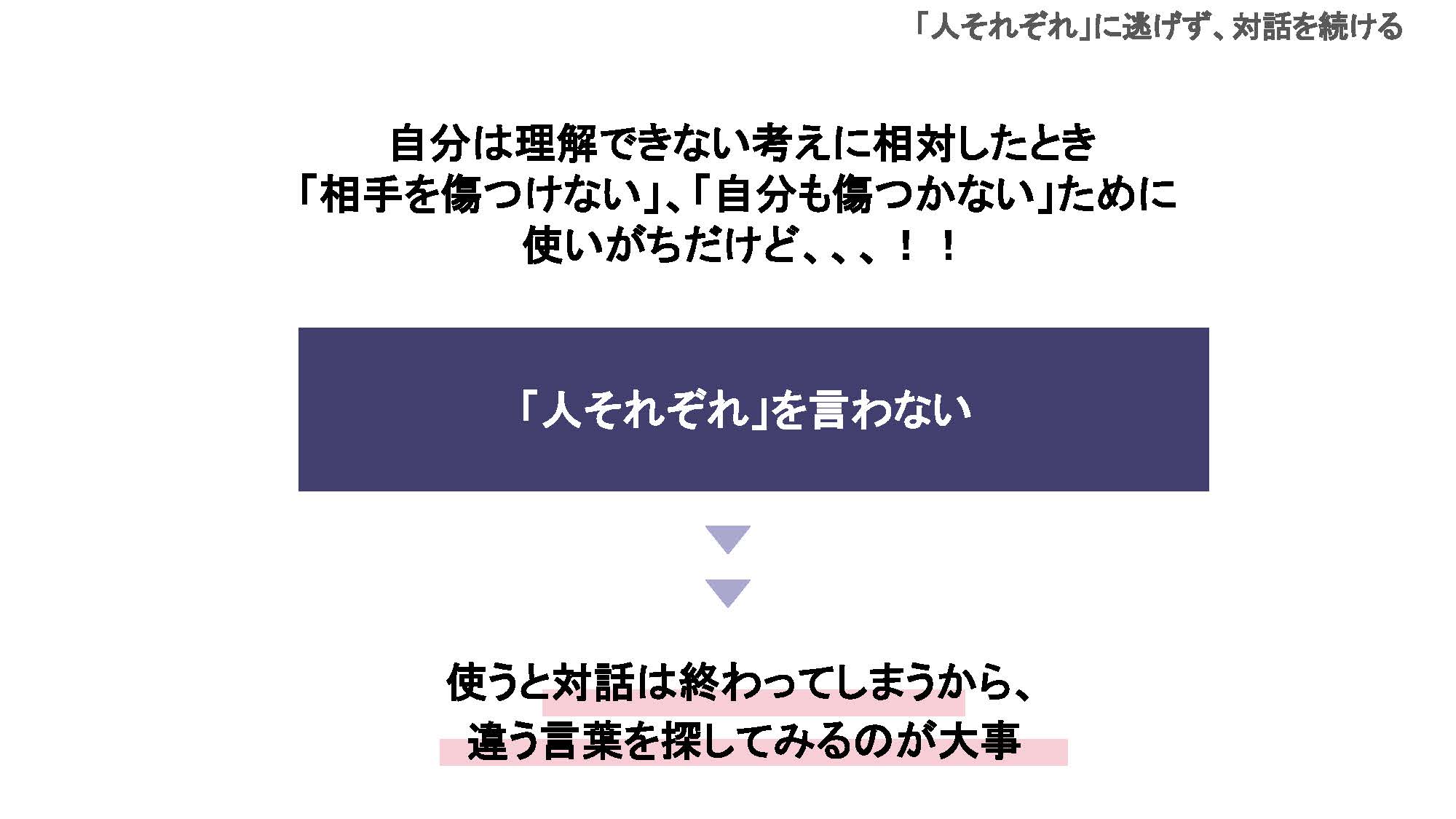 ・「多様性」の言葉の曖昧さや、捉え方の難しさを感じつつも、具体例を通じて理解が深まった。