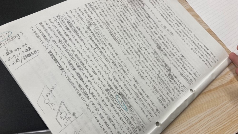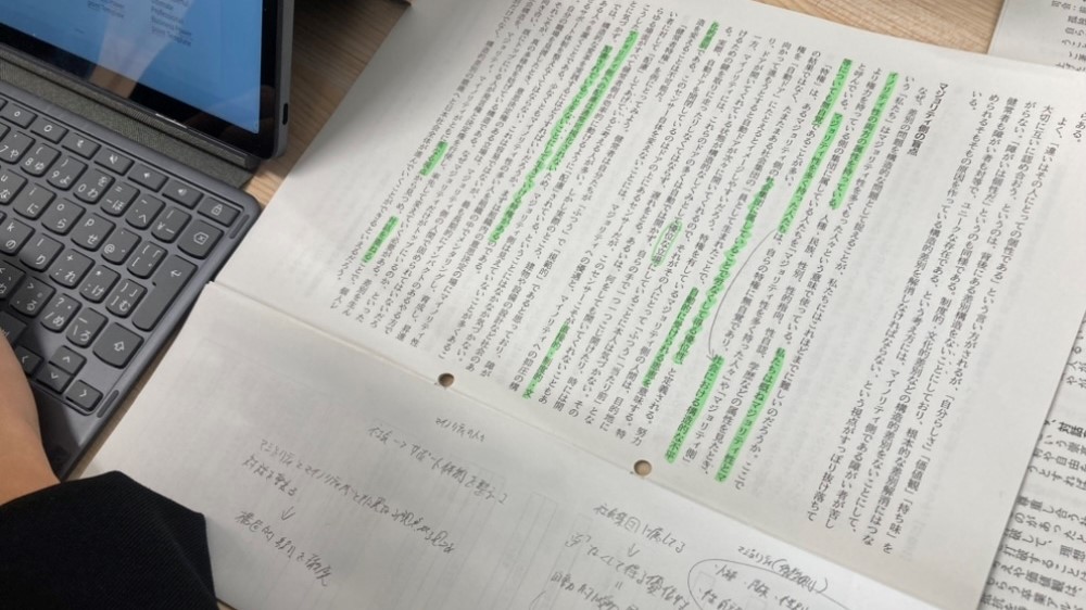テーマに関連する文章を読み、知識を増やしたうえで、多角的な視点から物事を見つめて小論文を書く。