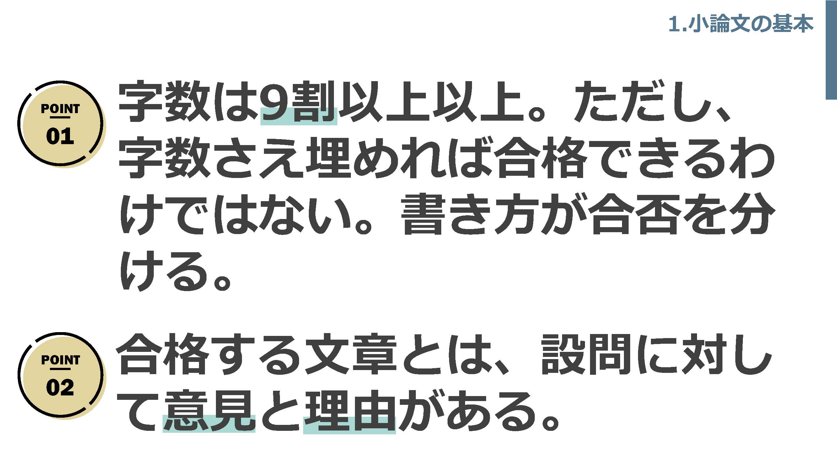 ・小論文では、自分の考えや意見が多くなってしまい、実際の調査やアンケートなどでの割合や結果などを組み込むことができず、根拠に欠ける文章になってしまったから。