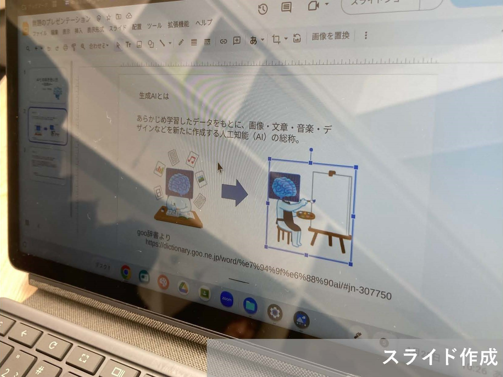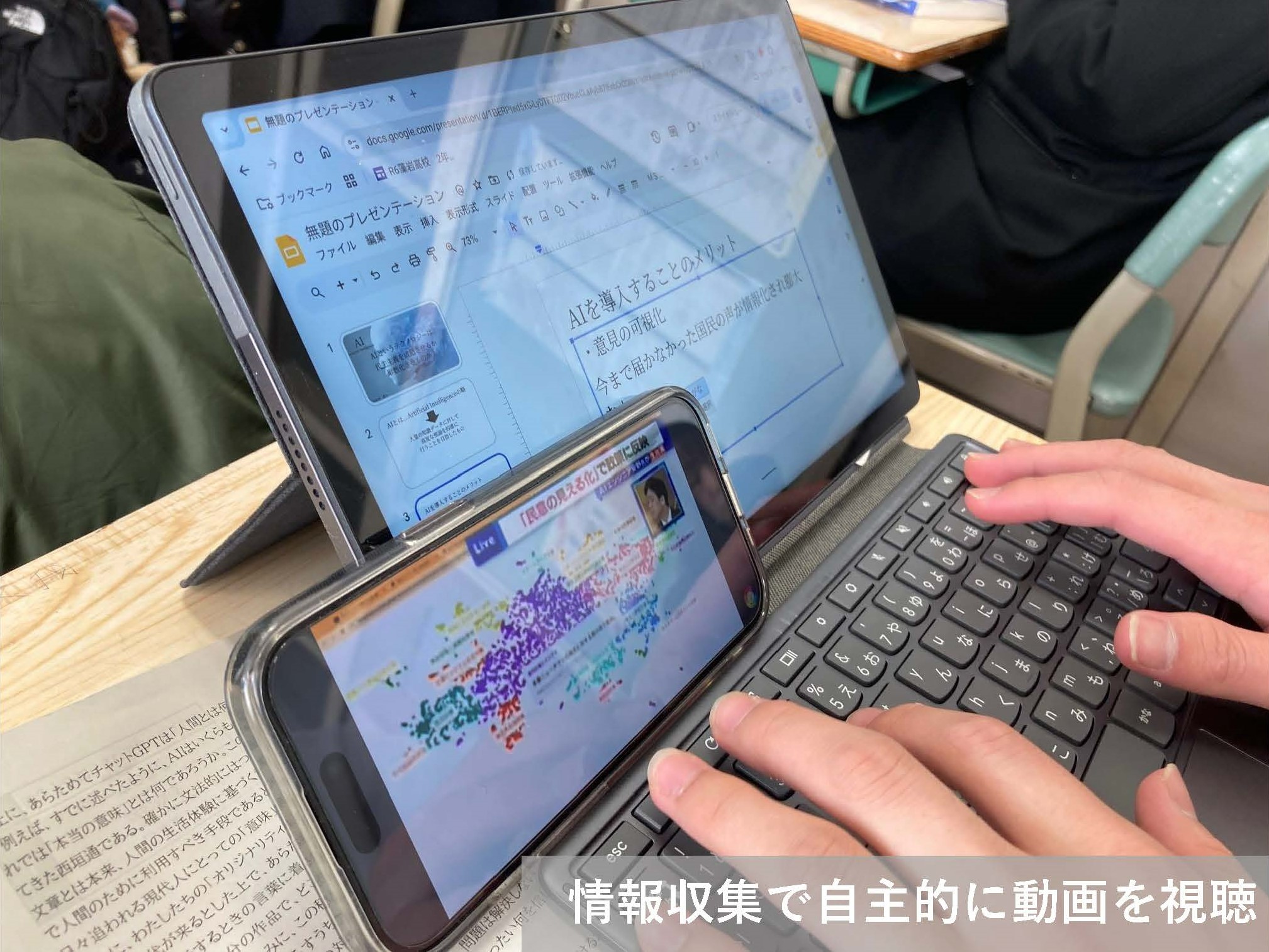 この授業を通じて、多くの生徒が生成AIについて深く学び、実際に自分の考えを整理し、情報を収集する力を高めました。授業では、AIのメリット・デメリットを理解し、それを基に自分の考えを発表することが求められました。生徒たちは、スライド作成や動画制作を通じて、論理的な構成を学び、情報を相手にわかりやすく伝える方法を考えました。また、他の生徒の発表を視聴することで、自分の考えを広げ、異なる視点を学んだことが大きな収穫となっています。