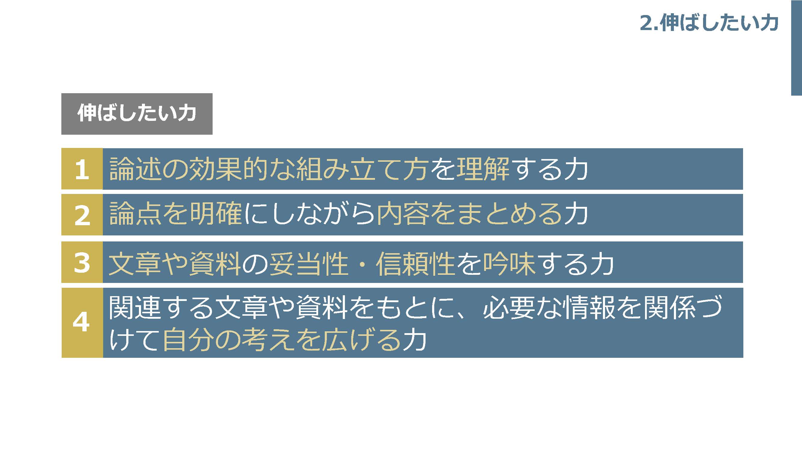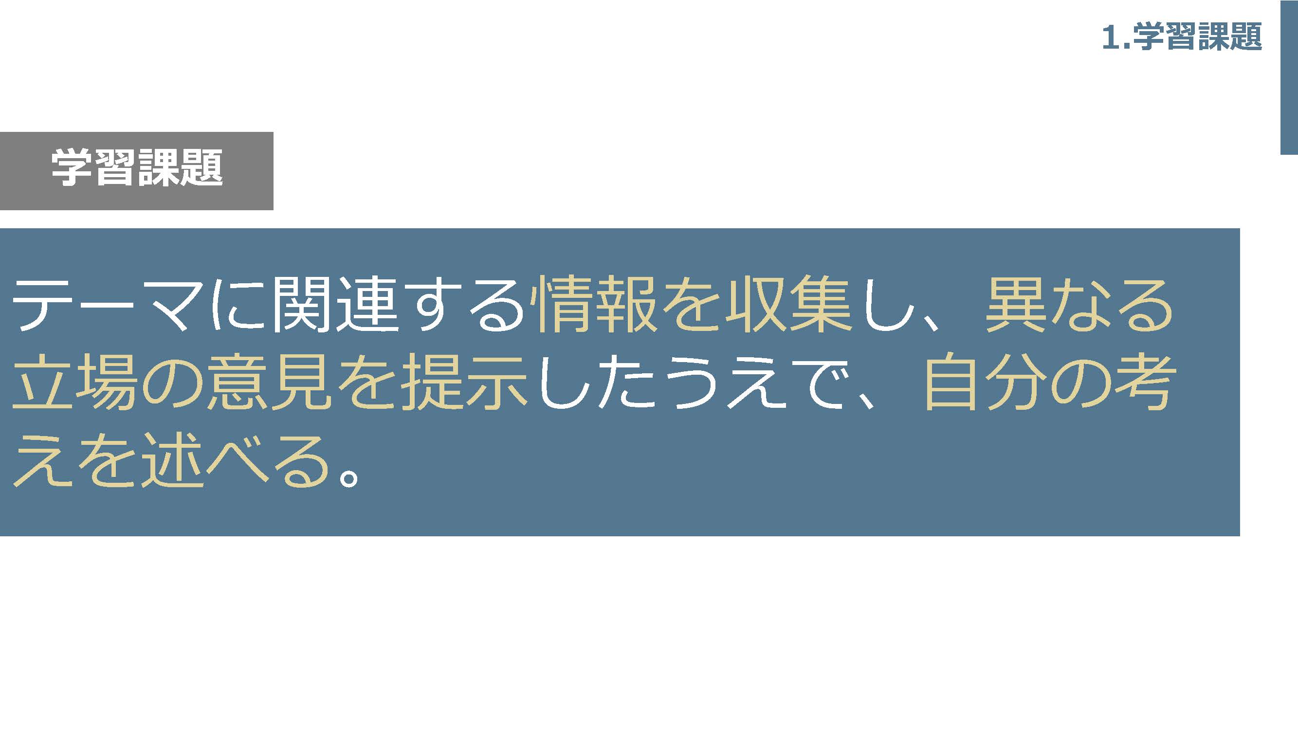 テーマに関連する情報を収集し、異なる立場の意見を提示したうえで、自分の考えを述べる