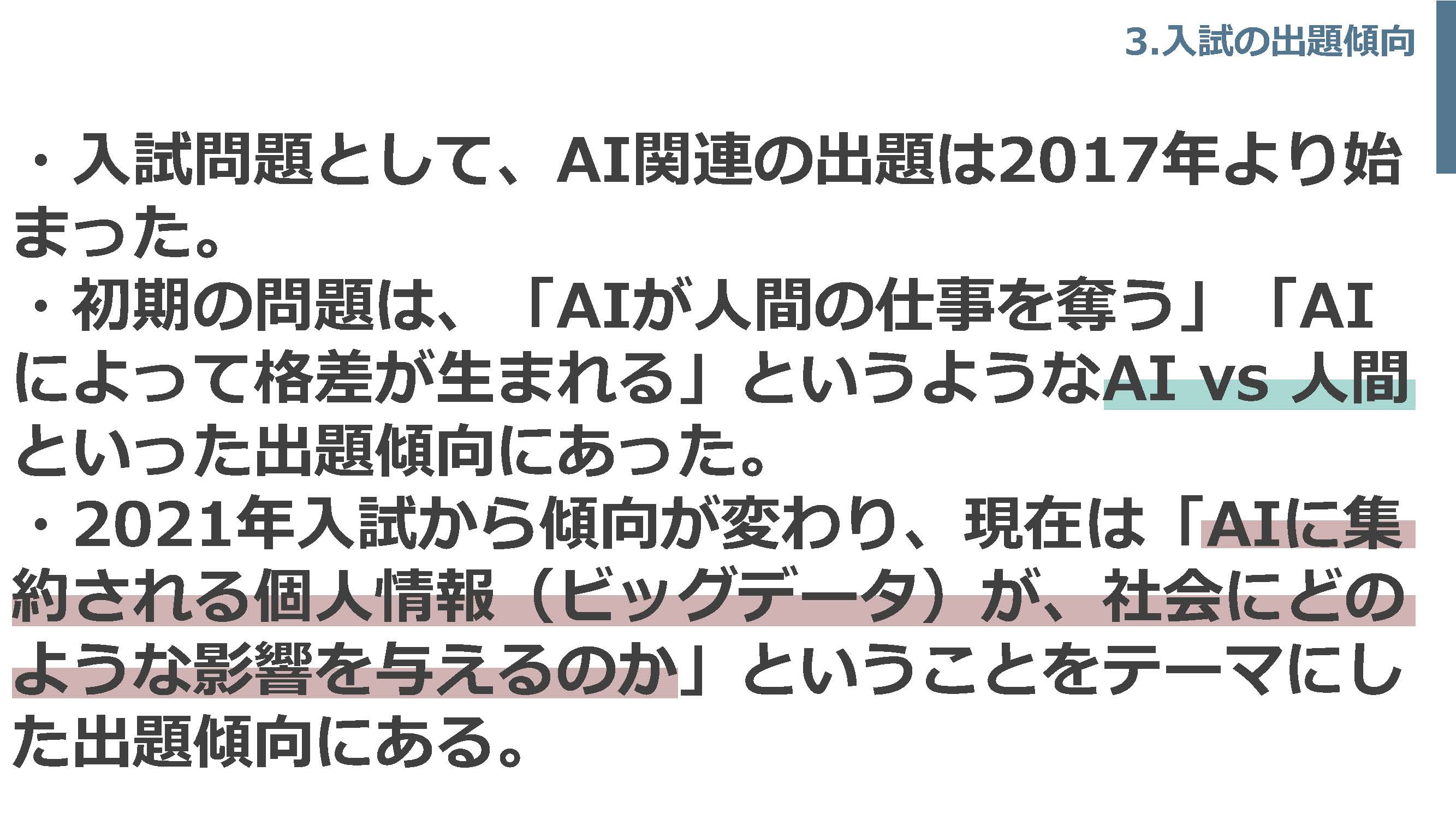 初めに、入試においてAIをテーマにした出題がトレンドになっていることを伝えました。
