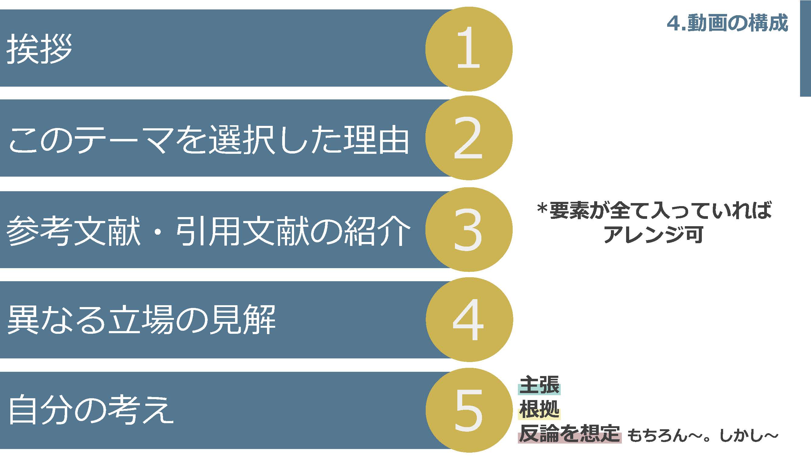 ④自分の考え(主張,根拠,「もちろん~。しかし~」といった形で反論を想定しながら述べること)