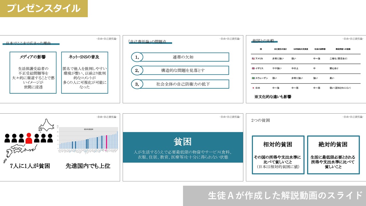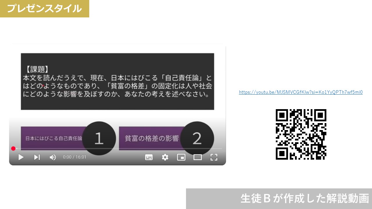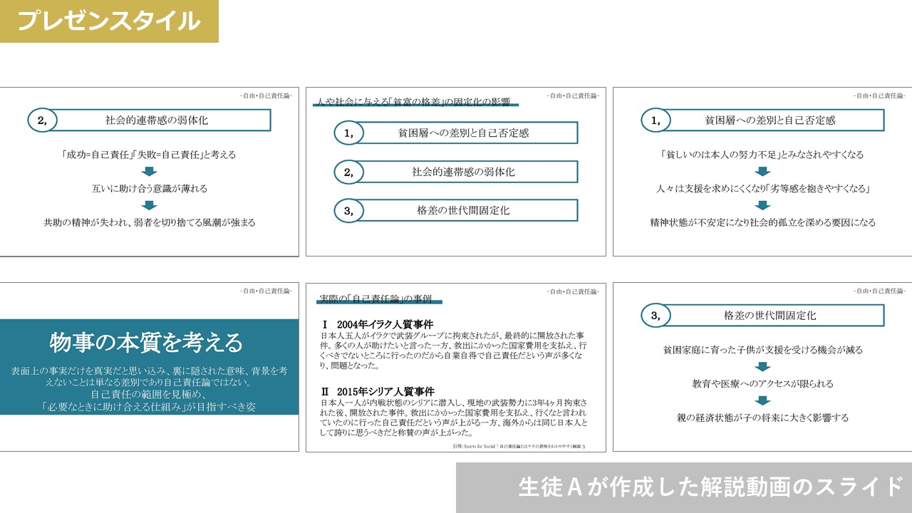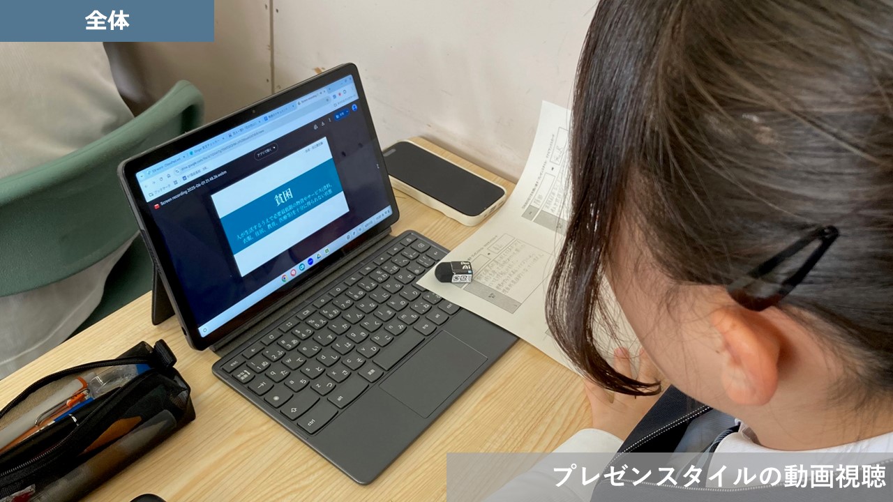 c.プレゼンスタイル:共通課題に関する情報を収集し、スライドを作成した後、解説動画を作成したうえで、小論文形式で共通課題に取り組む。