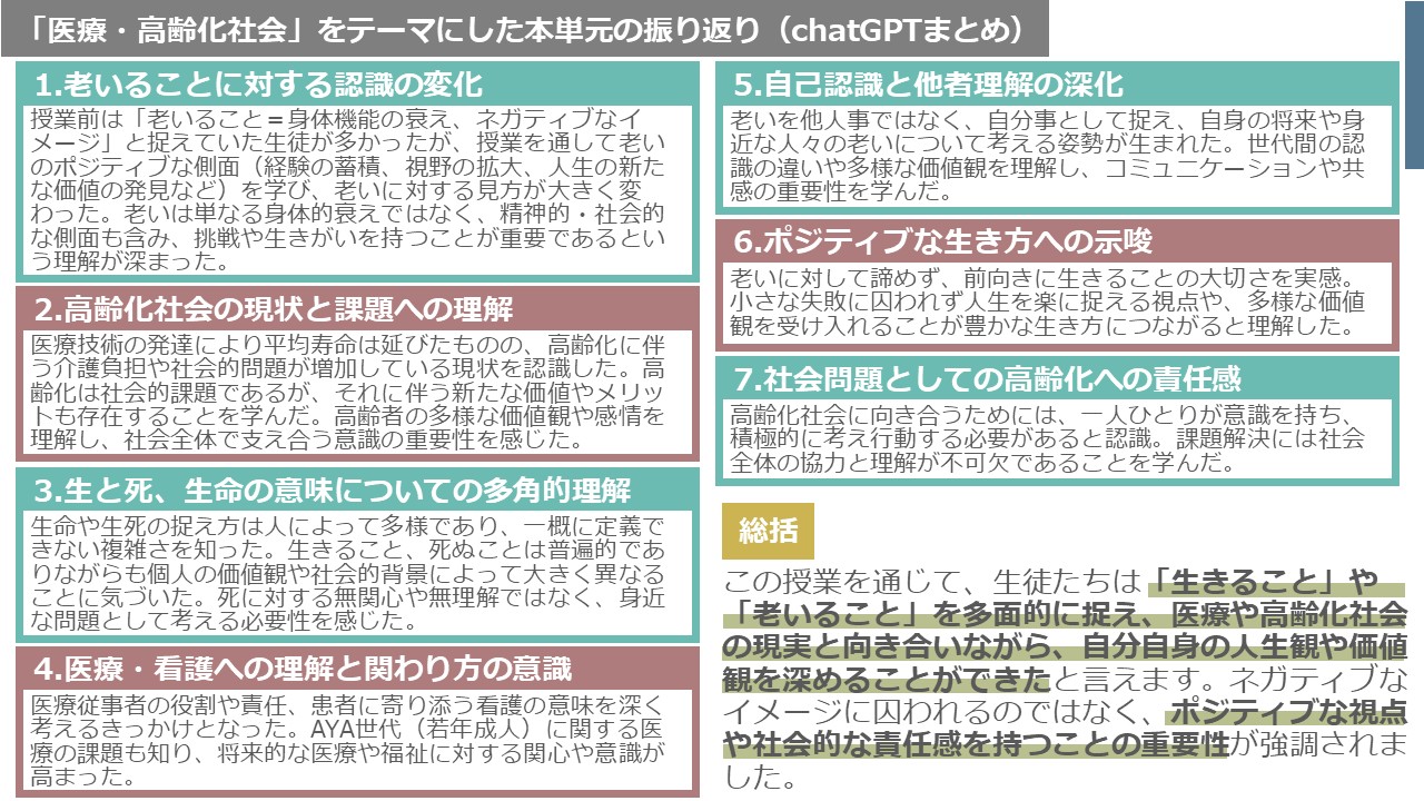 「医療・高齢化社会」をテーマにした2つ目の単元の振り返りを行い、生徒の回答をChat GPTでまとめると以下の結果となりました。