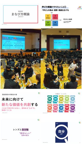 本日は、一年生を対象として、学びの視点・視野・視座を広げ、学び=楽しいへのマインドシフトを目指し実施した「学び方概論」を紹介します。前半は、本校のコーディネータである株式会社「コエルワ」の阿曽沼様のコーディネートで「藻岩高校での学び」を考えるワークショップを実施していただきました。視点であるレンズ獲得の重要性や、視座を高めることで視野が広がること、さらには周囲の人とレンズを共有することで、多様性を受け入れる包摂性を身に付けることができることなどを学びました。さらに、最も大切なレンズは『自分』であり、自分軸を確立するうえで最も大切であることを実感できたようです。