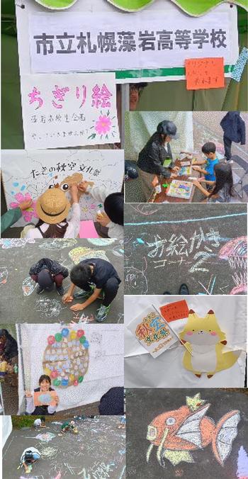 当日は、公園内の広い道路をキャンバスにクレヨンを使って「お絵かきコーナー」で多くの子どもたちと共に絵を描いたり、藻岩高校ブースでは、ちぎり絵体験や栞づくり、野生動物との共生に向けたメッセージ募集等を行い、家族連れの方々と交流を行いました。芸術や探究成果をコミュニケーションツールとして活用している姿がとても素敵でした。