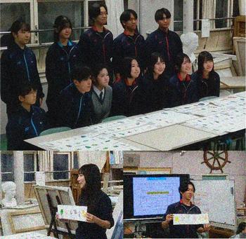 本校からはAで様々な葛藤の中で送る本校での学校生活の模様、Bで本校2年生の2グループがMSPでの活動内容、Cで本校の単位制や探究活動の魅力、Dで『まなびまくり社』での活動、Eであらたなまちづくりへの提案を行いました。