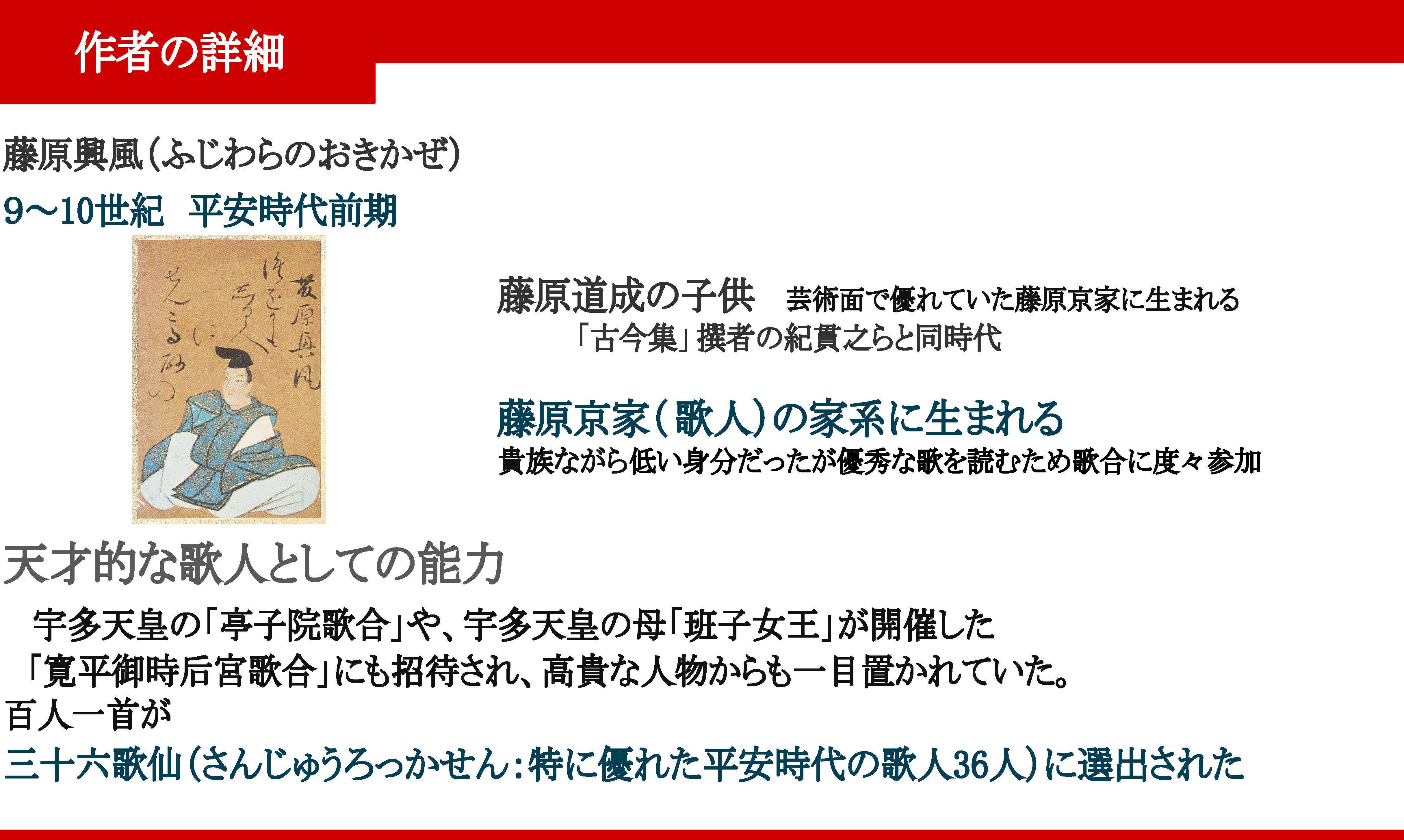配付された資料をもとに、『小倉百人一首』の中から「お気に入りの一首」を選び、その魅力を紹介するスライドを作成してもらいました。なお、「a.和歌・文法的説明・現代語訳」「b.作者の詳細」「c.この和歌の魅力(あなたの解釈や選んだ理由とともに)」を盛り込むように指示しました。