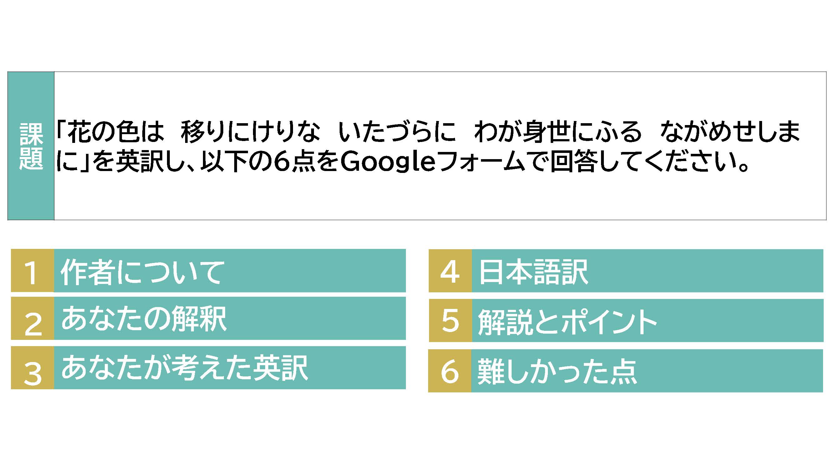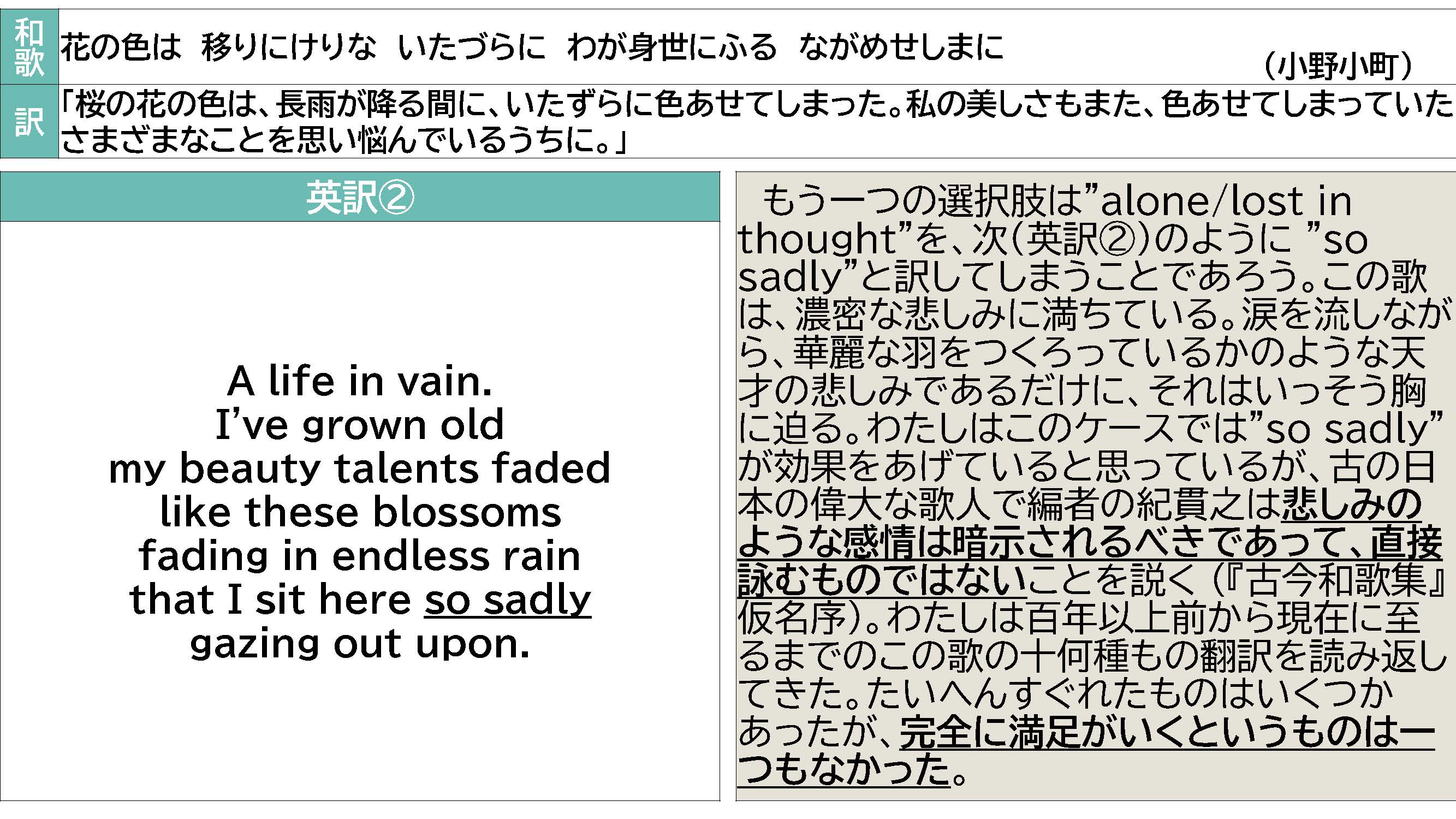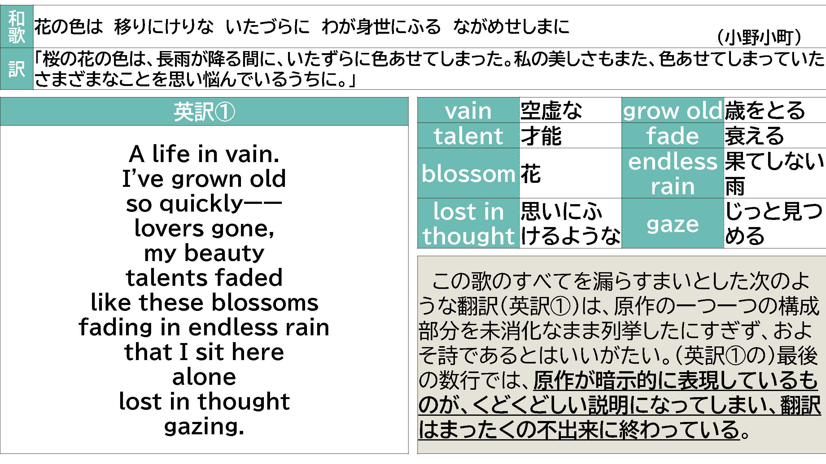 これを踏まえて、「花の色は 移りにけりな いたづらに わが身世にふる ながめせしまに」(小野小町)の英訳を考えるワークに取り組みました(2~4時間)。なお、「1.作者について」「2.あなたの解釈」「3.あなたが考えた英訳」「4.日本語訳」「5.解説とポイント」「6.難しかった点」を回答するように指示しました。