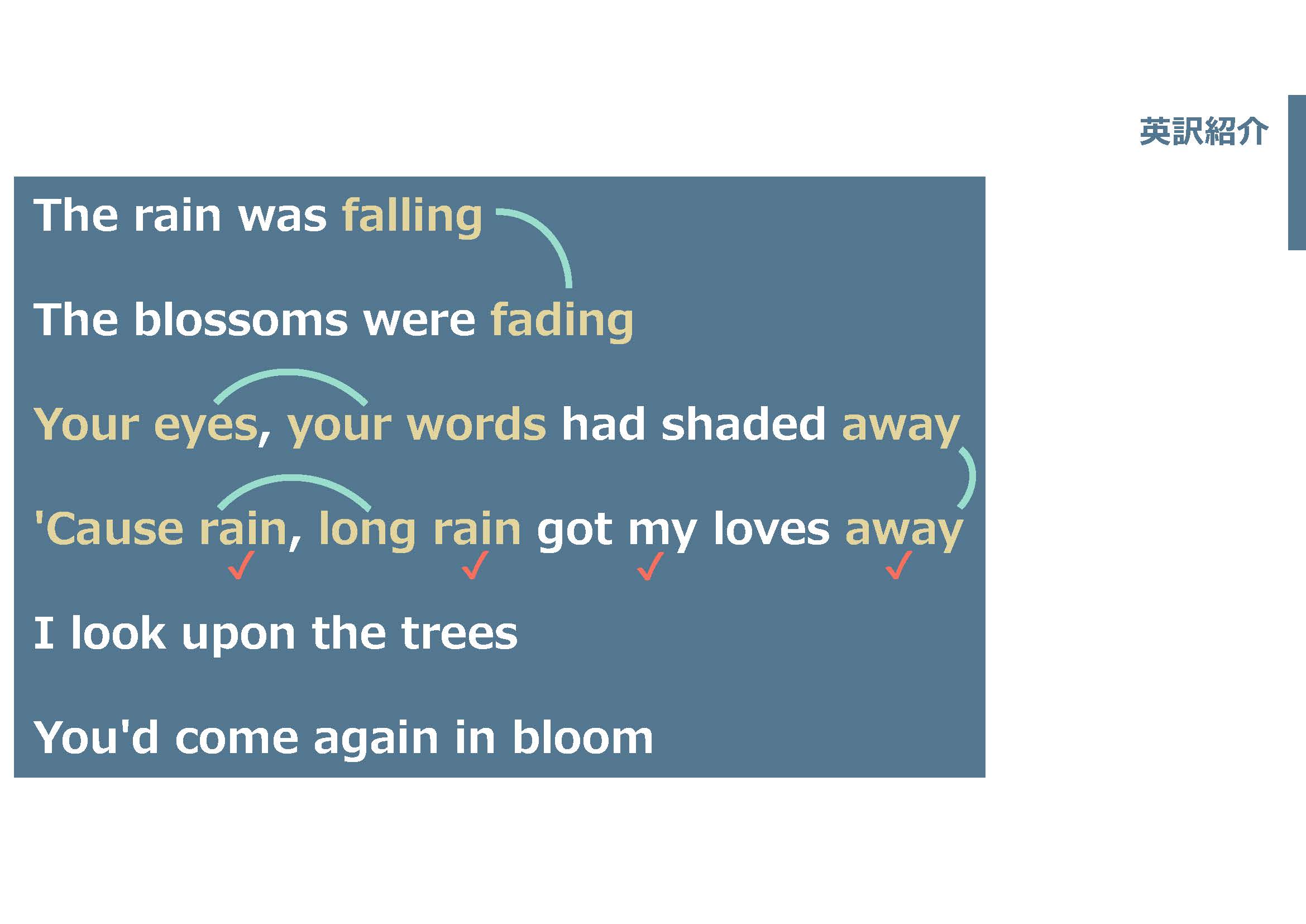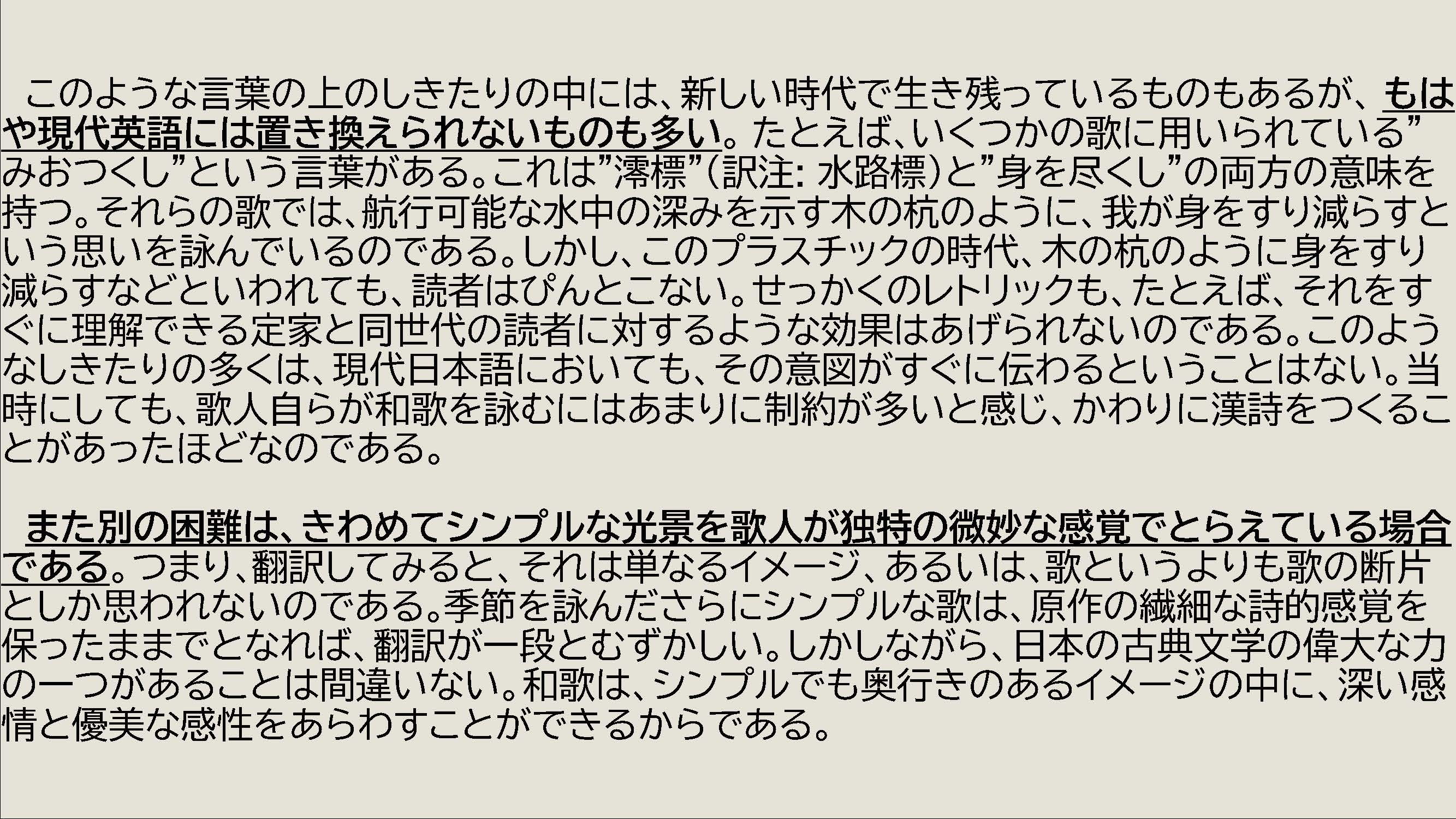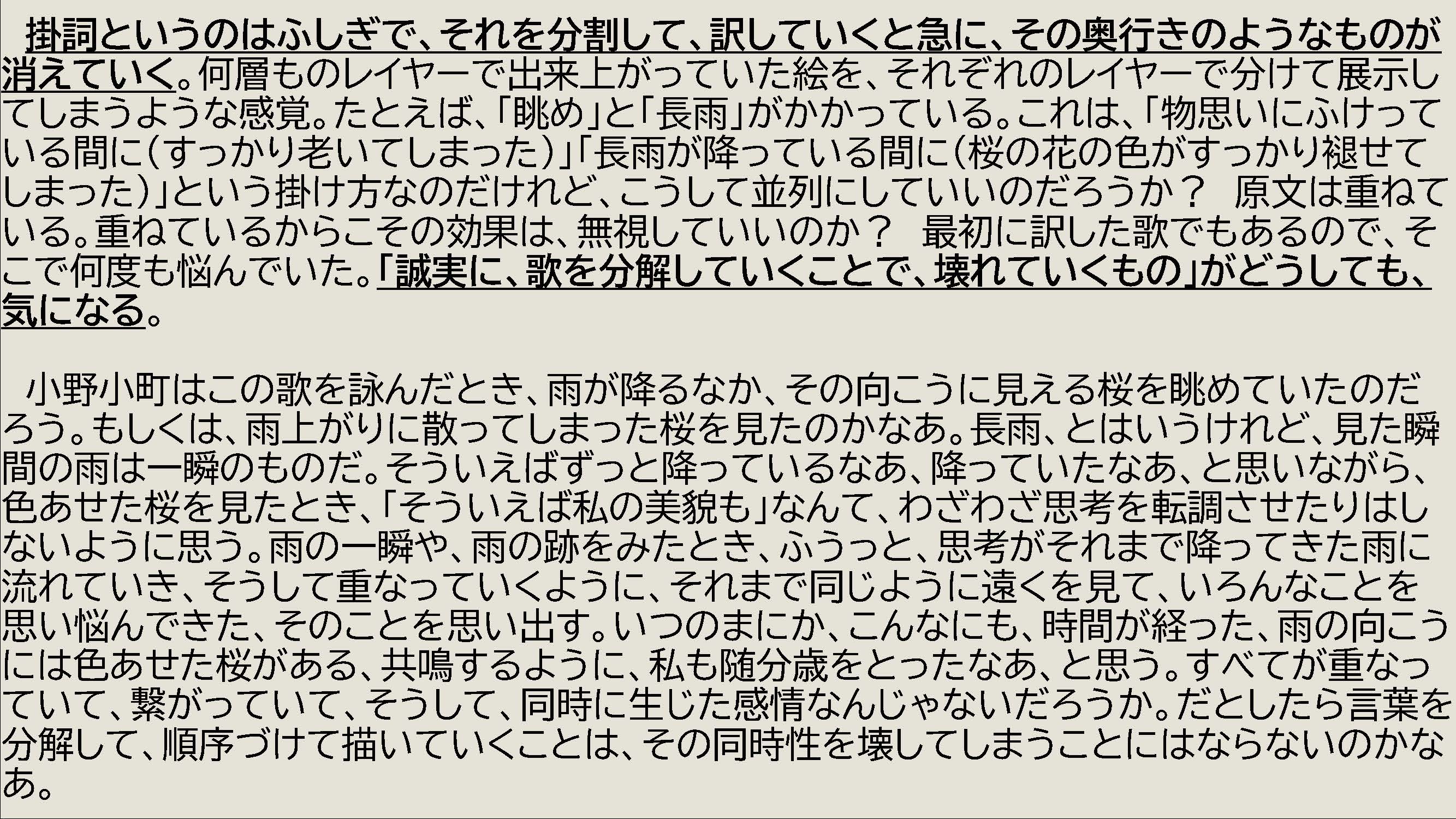これを踏まえて、「花の色は 移りにけりな いたづらに わが身世にふる ながめせしまに」(小野小町)の英訳を考えるワークに取り組みました(2~4時間)。なお、「1.作者について」「2.あなたの解釈」「3.あなたが考えた英訳」「4.日本語訳」「5.解説とポイント」「6.難しかった点」を回答するように指示しました。