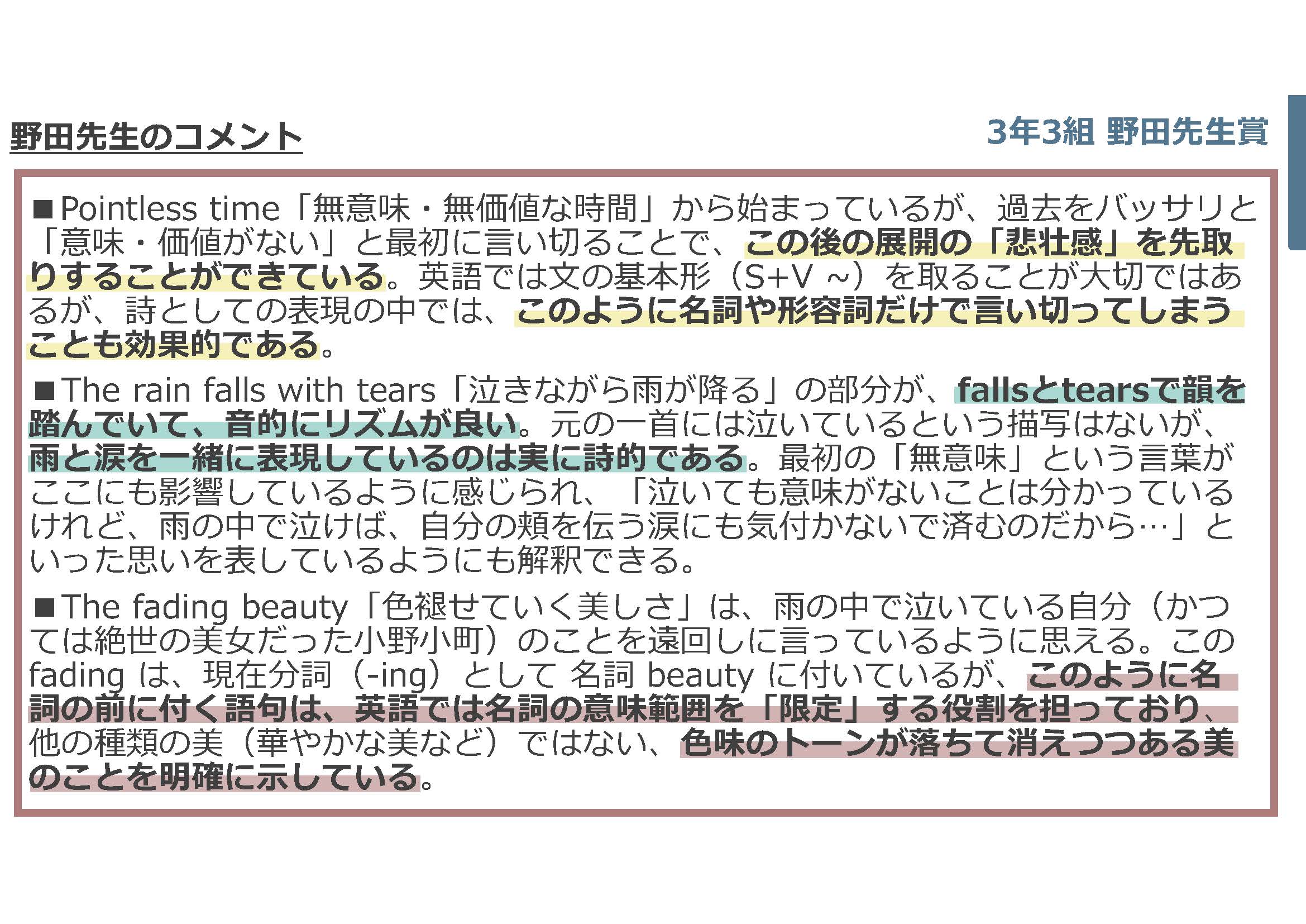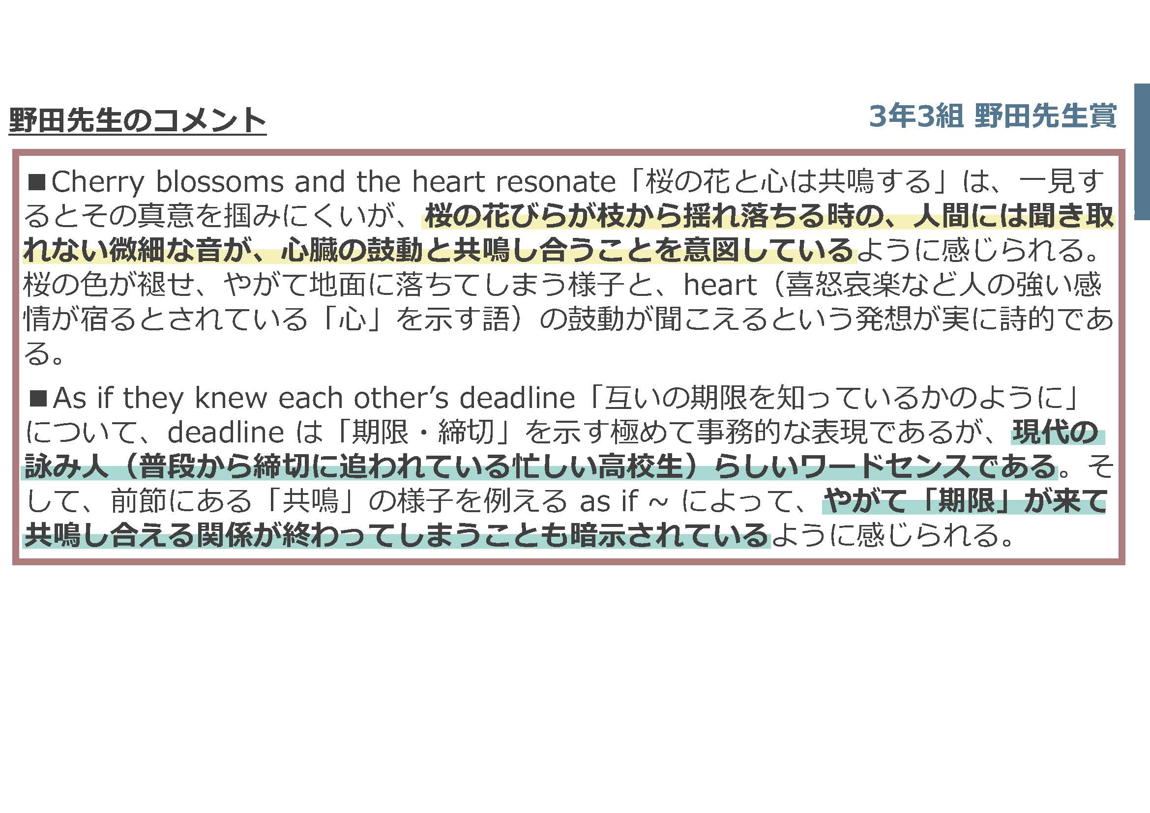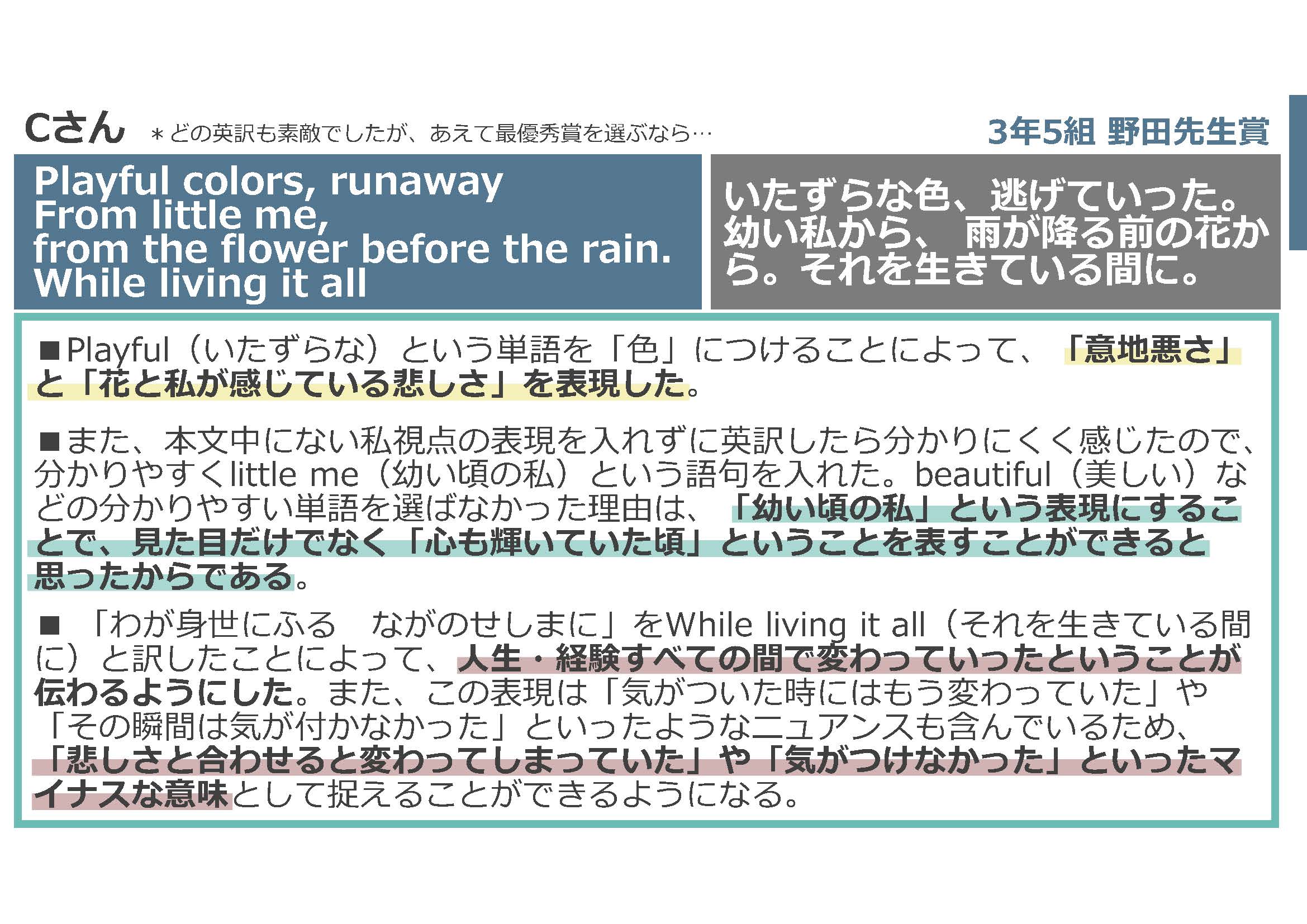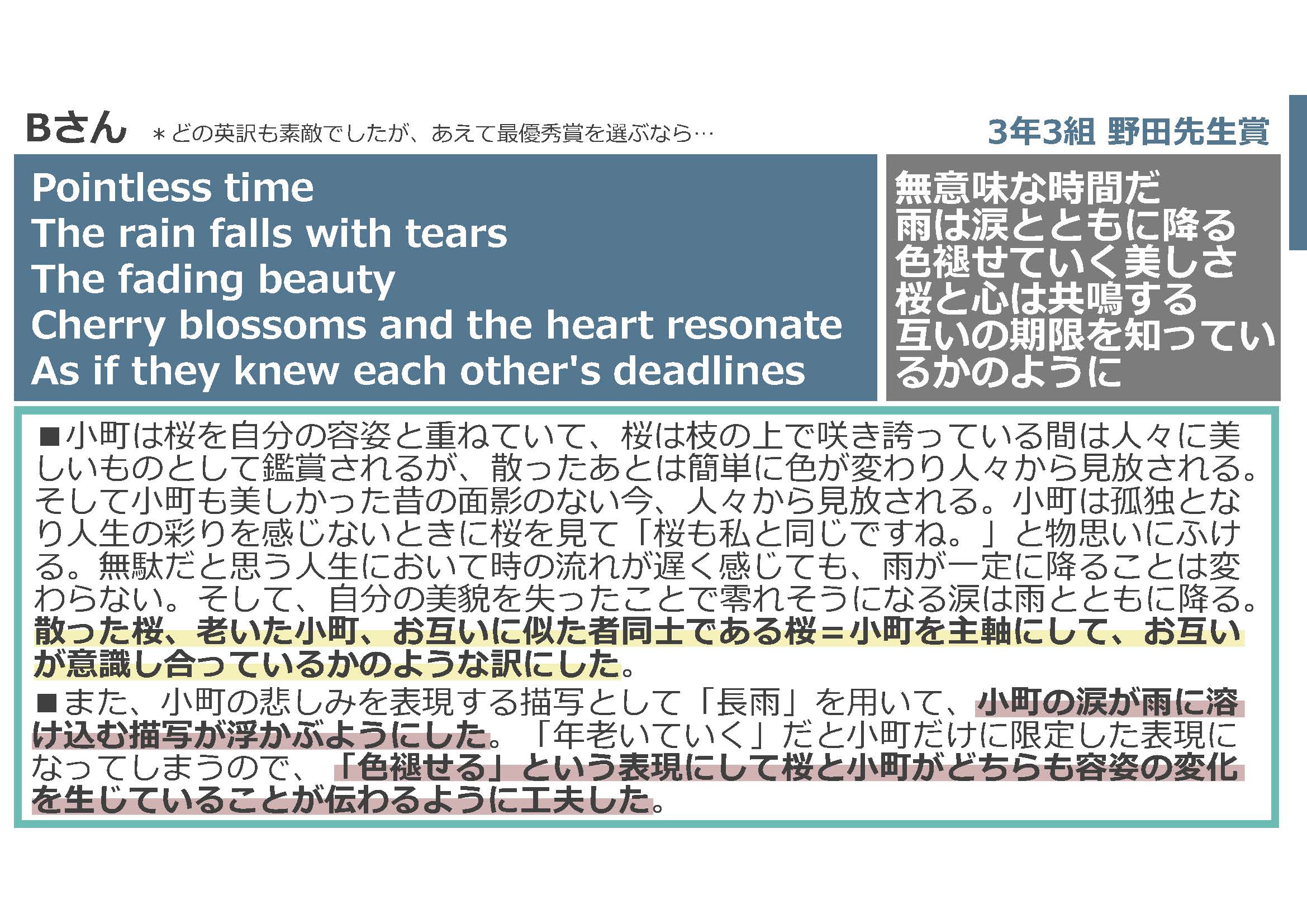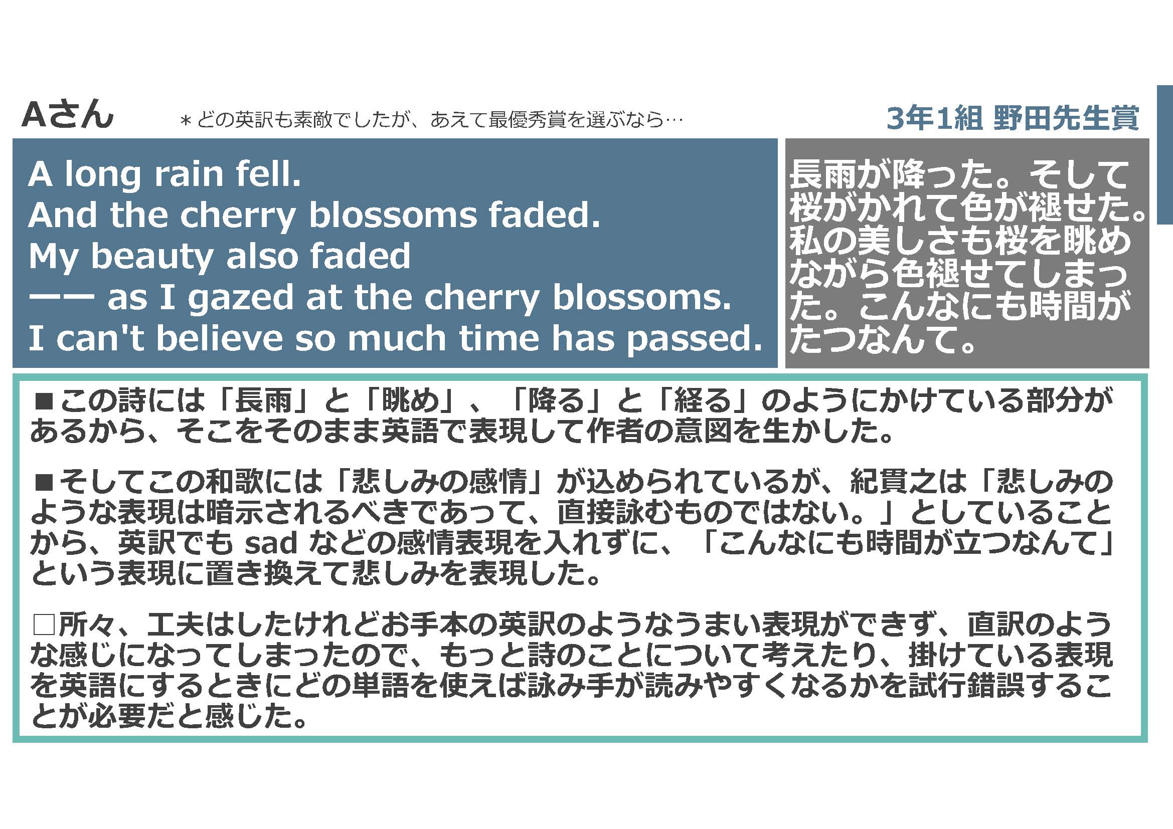 また、英語科の野田先生にご協力いただき、野田先生が作成した英訳を紹介しました。