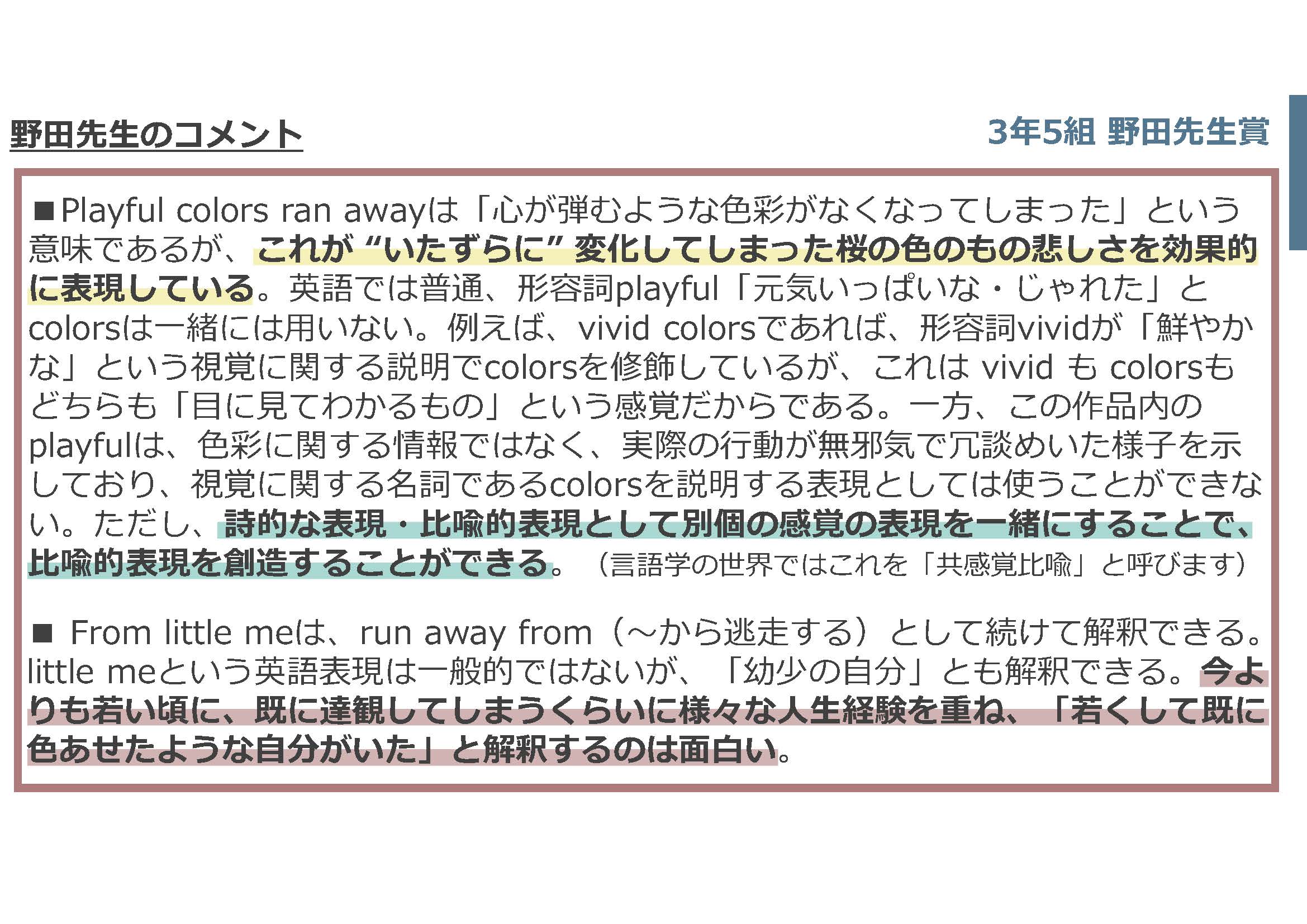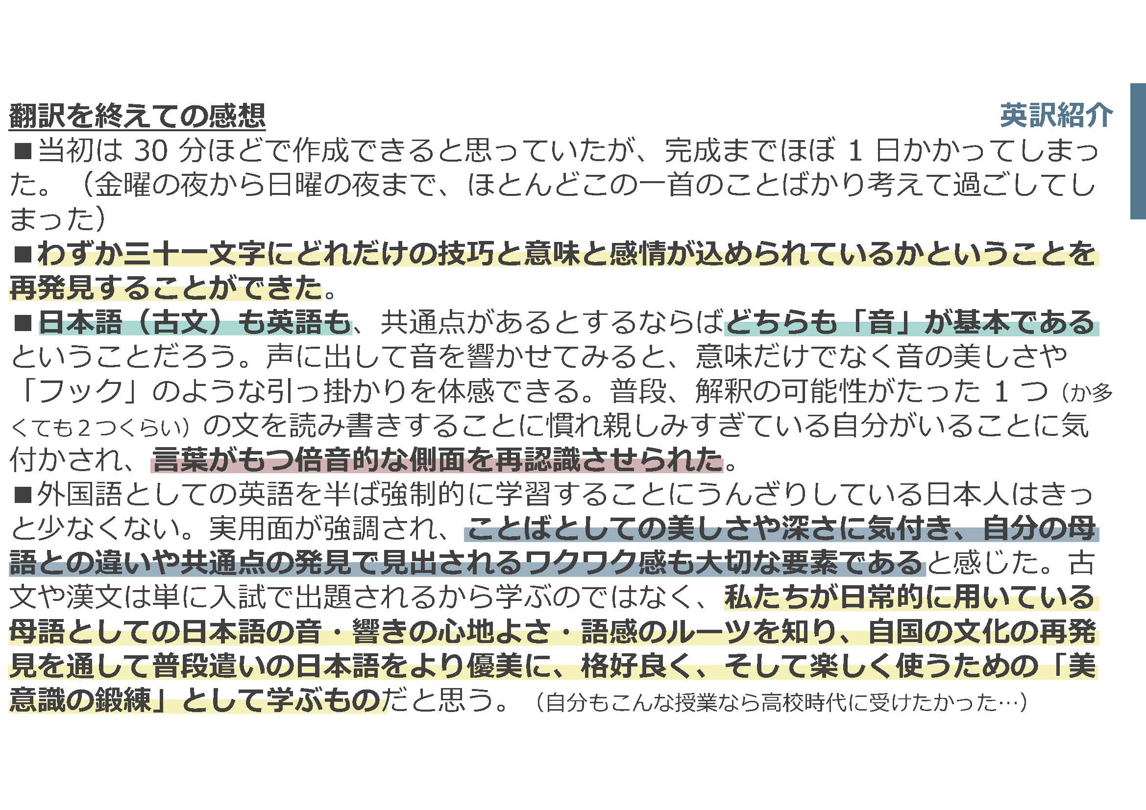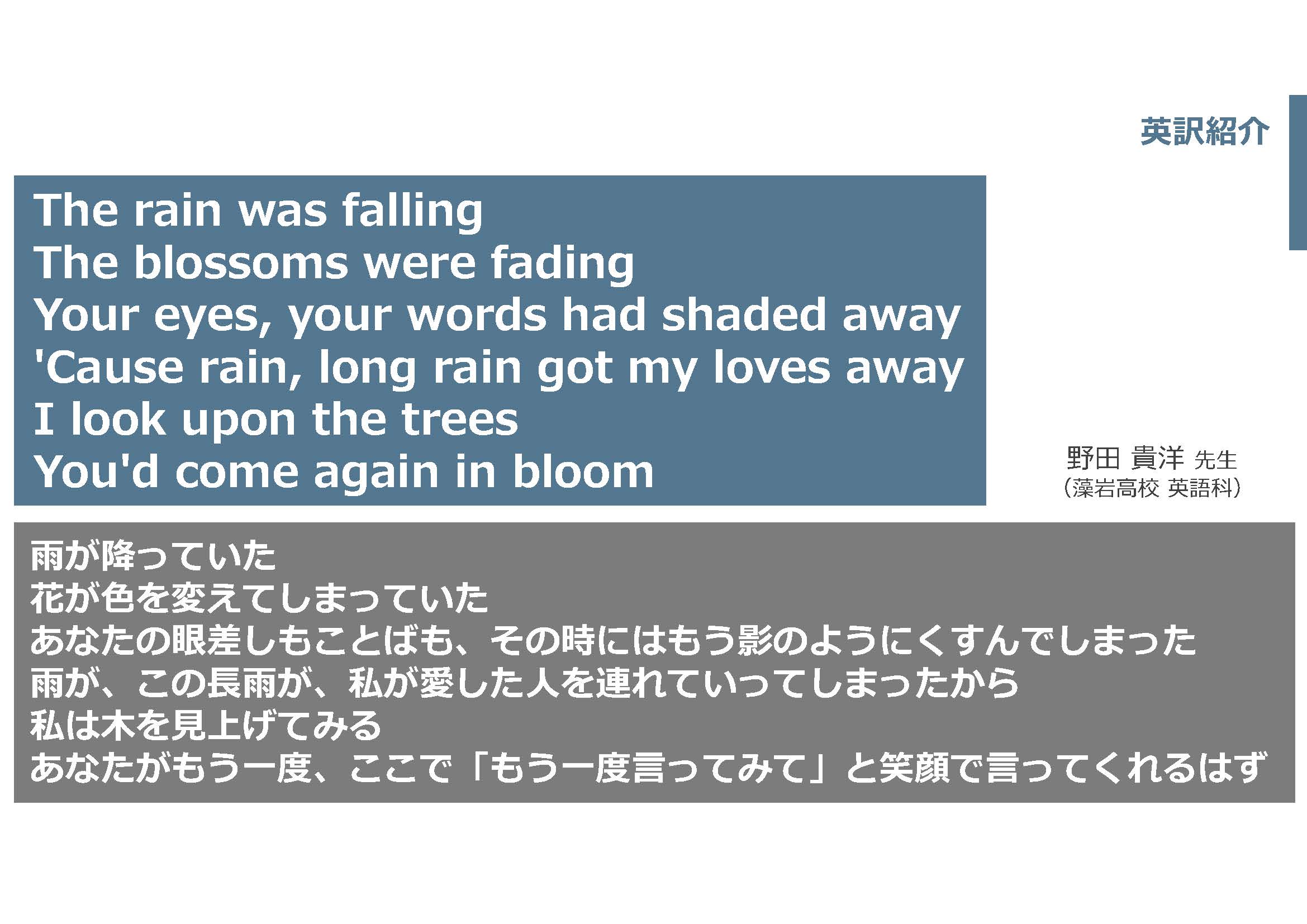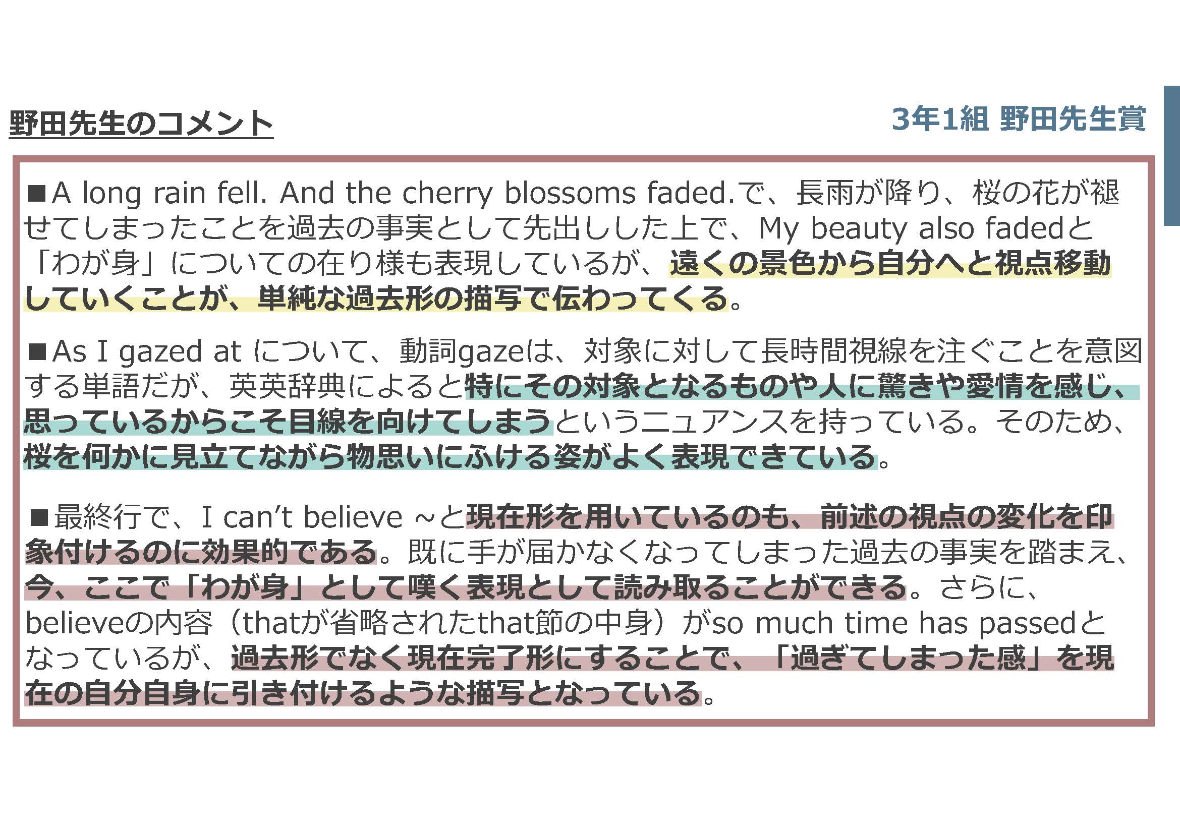 また、英語科の野田先生にご協力いただき、野田先生が作成した英訳を紹介しました。