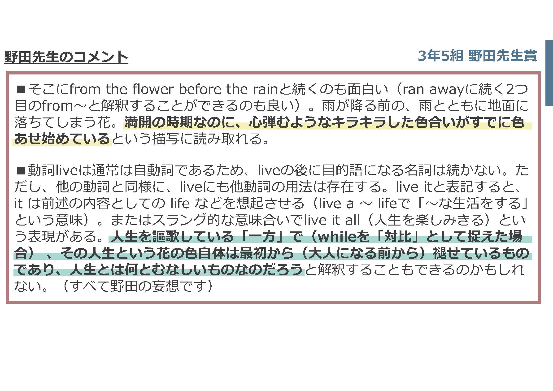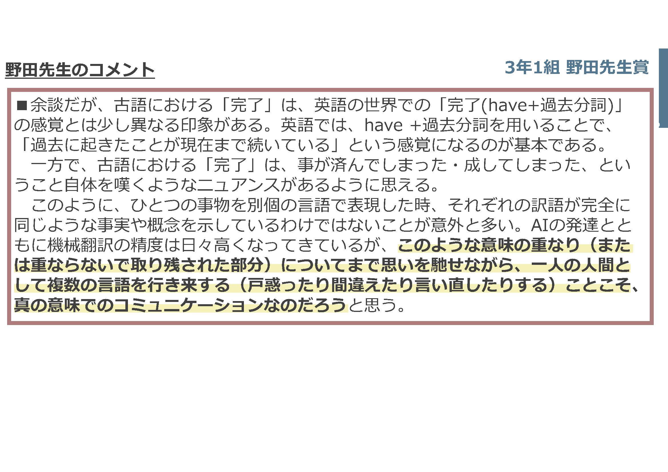 最後に、各クラス1名、野田先生に最優秀賞を選んでいただき、講評を含めて「野田先生賞」を発表しました。