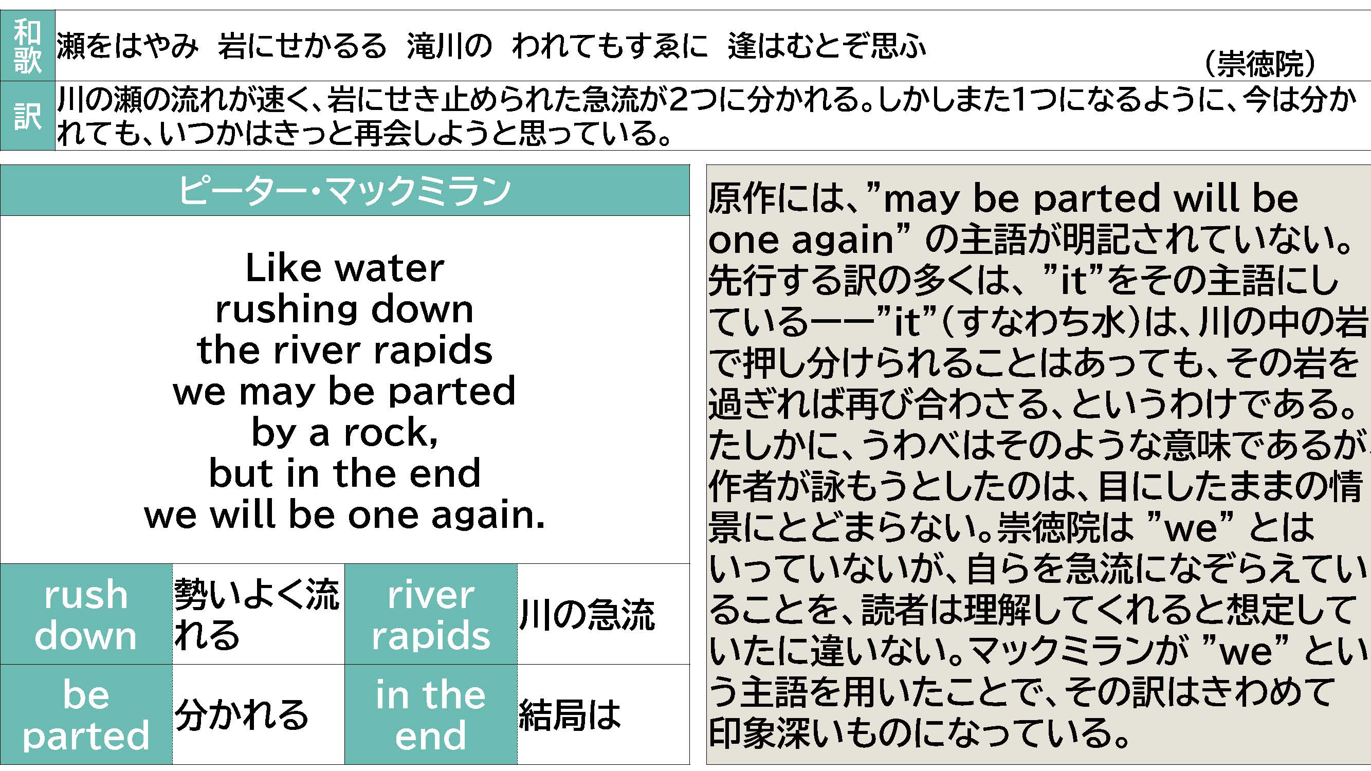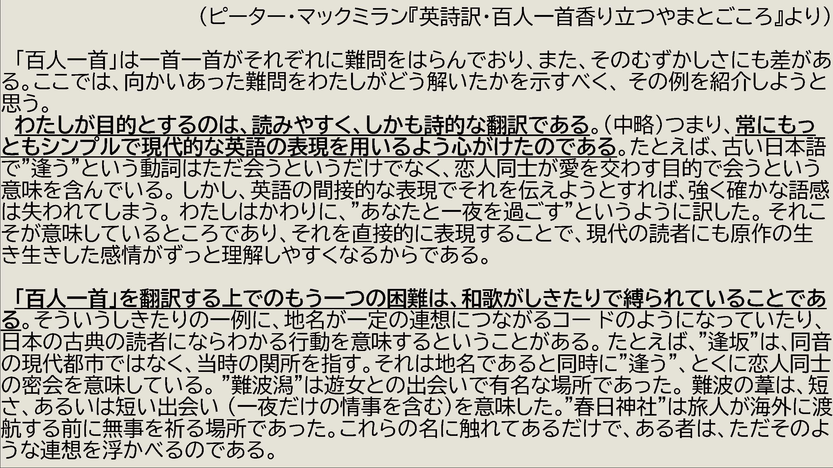 まずは、ワークシートをもとに百人一首の英訳について解説しました。(参考資料