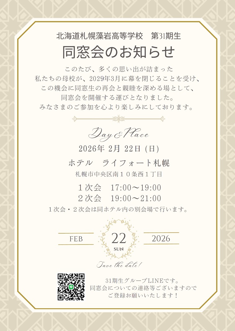 このたび、多くの思い出が詰まった藻岩高校が2029年3月に閉じることを受け、第31期生の再会と親睦を深める場として、同窓会を下記のとおり開催することとなりました。