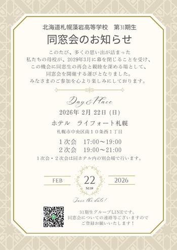 このたび、多くの思い出が詰まった藻岩高校が2029年3月に閉じることを受け、第31期生の再会と親睦を深める場として、同窓会を下記のとおり開催することとなりました。