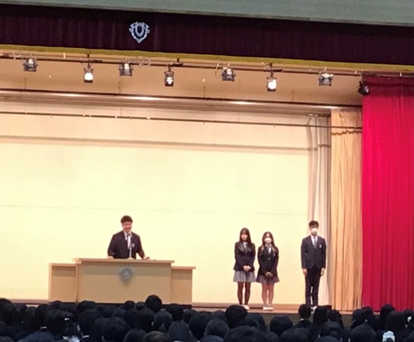 校長先生のお話の中では、「継続することの意義、やめることの勇気、新しいスタートのチャンス」について、ご自身の語学学習を取り上げてお話されていました。認証式では、新生徒会執行部(11期)が認証され、旧生徒会執行部(10期)が任期満了となりましたが、どちらの会長も校長先生の話を受けて挨拶の中に語学学習の話題を加え、和やかな雰囲気の中で交代が行われました。賞状伝達式では、美術部、男女テニス部、陸上部、新聞局が素晴らしい成績の表彰が行われました。