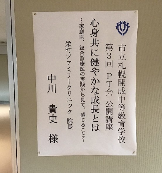 公開講座では、栄町ファミリークリニック院長の中川貴史様に「心身ともに健やかな成長とは」というタイトルで講演をいただきました。
