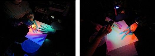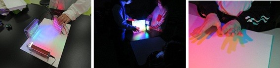 色付きの発光ダイオードや色付きセロハンを貼り付けた白色発光ダイオードで三原色の光をつくり、その光をそれぞれ手で遮ってみました。