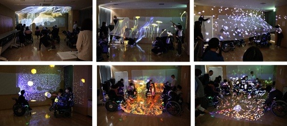三角山の先生が用意してくれたハンドスクリーンを用いて、大きな映像を鑑賞し、揺れるスクリーンに包まれ、最後は、自作のポイで映し出された魚を捕まえました。