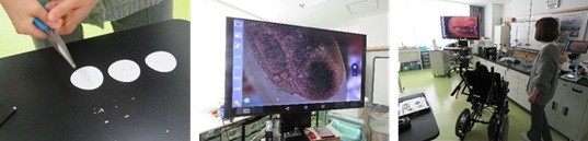 屋上庭園で収穫したお米と、水に浸して発芽したお米、さらに、市販のもち米を縦や横に割って、断面にヨウ素溶液を滴下して、染まり方や色の違いを調べてみました。