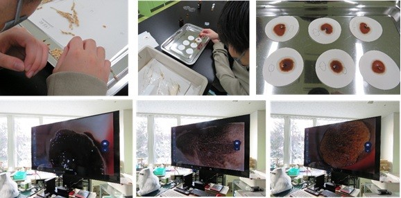 屋上庭園で収穫したお米と、市販のもち米を縦や横に切って、断面が上になるように木工ボンドでろ紙に固定して、ヨウ素溶液を滴下してみました。
