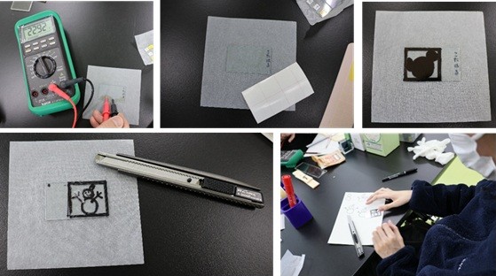 透明電極の表裏をテスターで確認して、ブックカバーフィルムを貼りました。次に液晶表示させる絵を考えました。