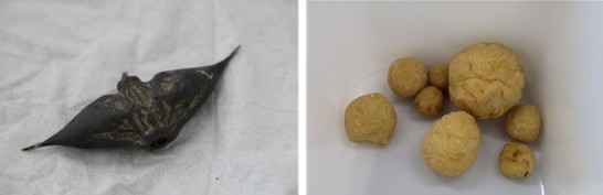 不思議な形状をした菱の実を観察しました。ウィキペディアには、食用以外に「忍者が追手の足を止める小道具」ともありました。