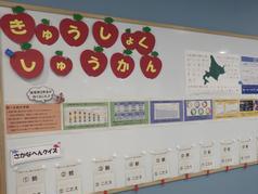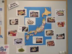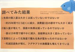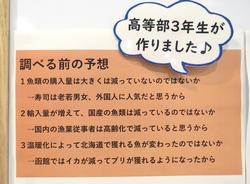 また、2階のエレベーターホールでは、『楽しもう!日本の魚』をテーマに掲示を行い、「魚へんの漢字クイズ」や「山の手 寿司王」など、みなさん楽しんで参加してくれました。高等部の生徒が、北海道の海でとれる魚や日本人の魚の購入量について学習の中で調べ、図やグラフを使って分かりやすくまとめた資料は、魚についての知識が深まる興味深い内容でした。