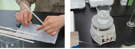 ミョウバンの種結晶を髪の毛や釣り糸に結び、溶液の中に浸して成長させました。