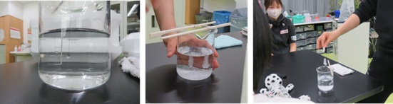 風船とスズランテープで静電気を体感しました。また、水道の水を静電気で曲げてみました。