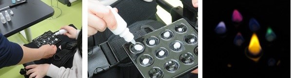 メタノールに浸し脱脂綿に6種類の塩類を滴下して炎色反応をやりました。